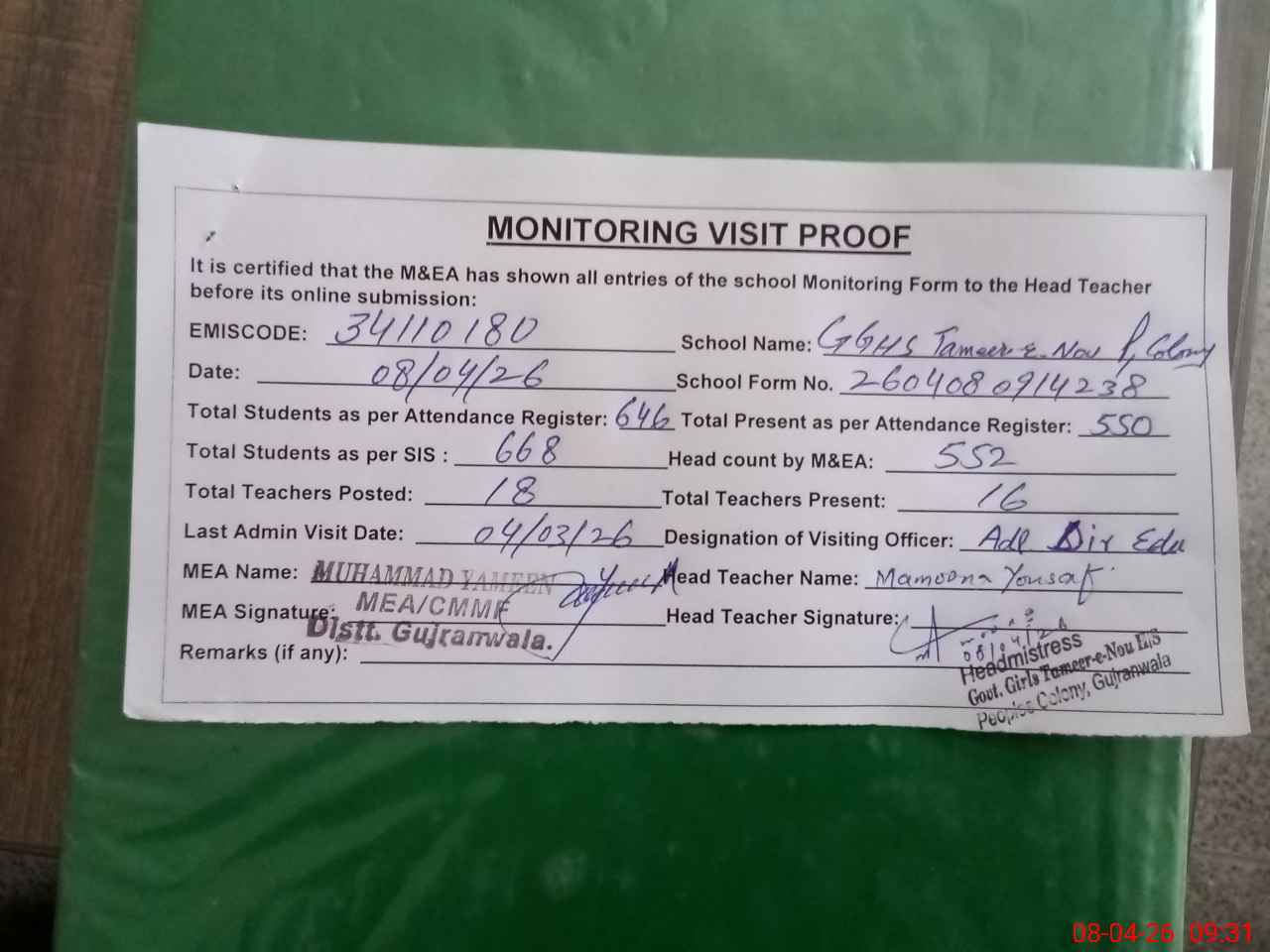 | Attendance Register | Head Teacher | MEA with School | Visit Proof |