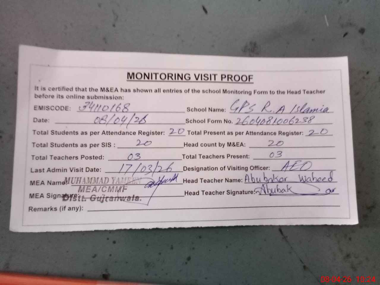 | EMIS Code: 34110168 | Name of School: GPS R A ISLAMIA | |||