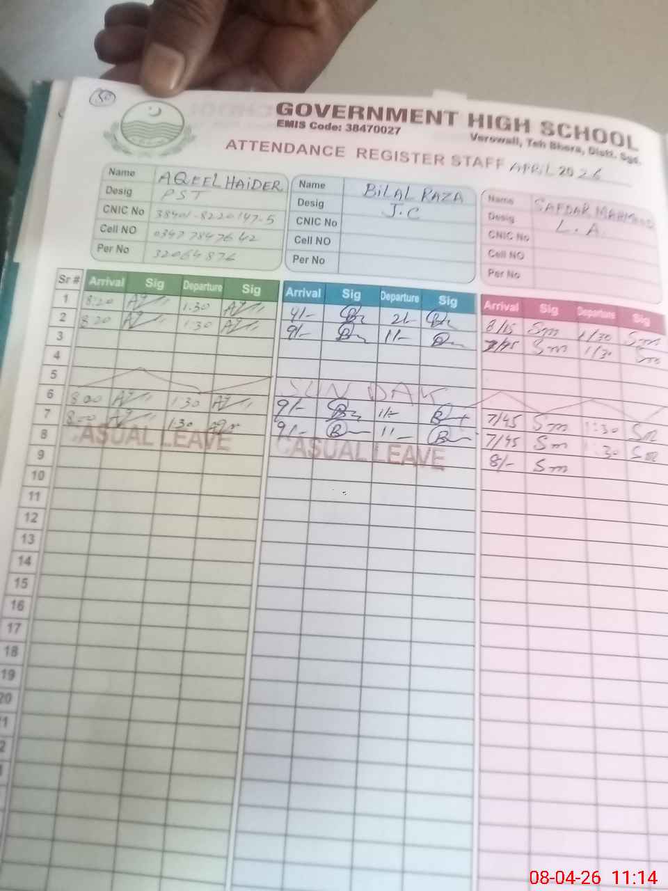 | CNIC | Full Name | Designation | R/C | Absence during last cal. month |