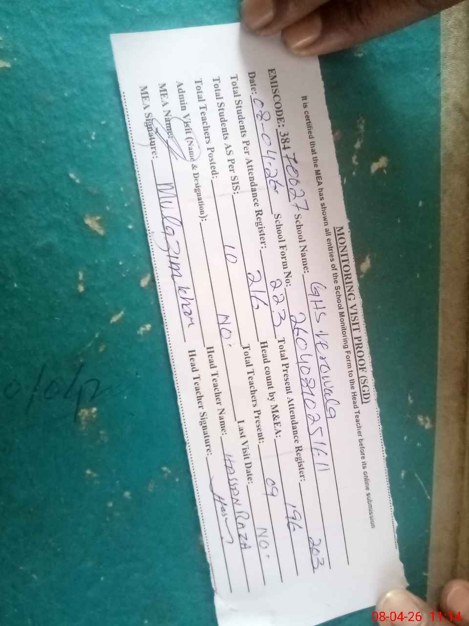 | Attendance Register | Head Teacher | MEA with School | Visit Proof |