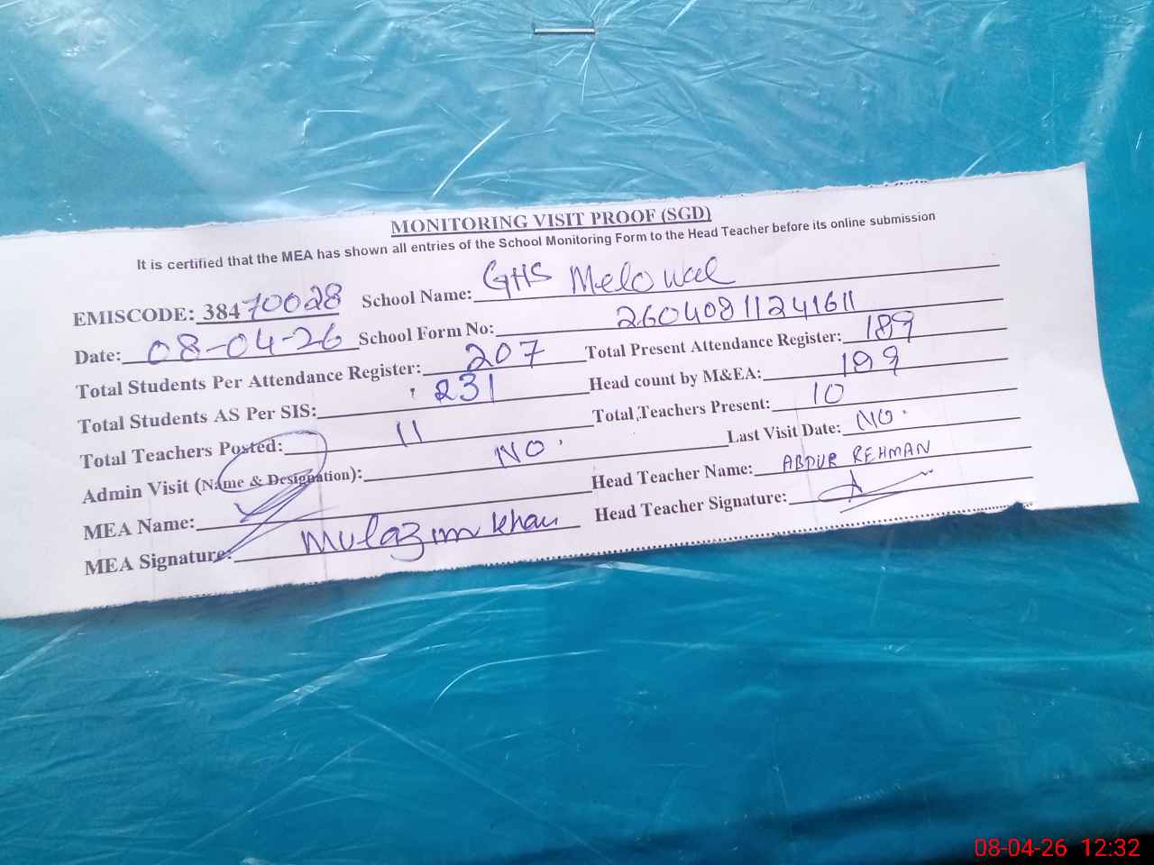 | Attendance Register | Head Teacher | MEA with School | Visit Proof |