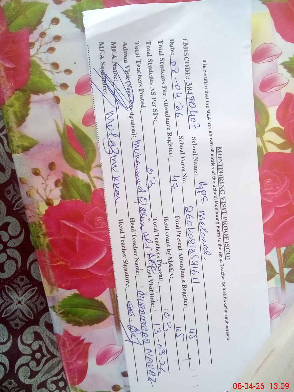 | Attendance Register | Head Teacher | MEA with School | Visit Proof |