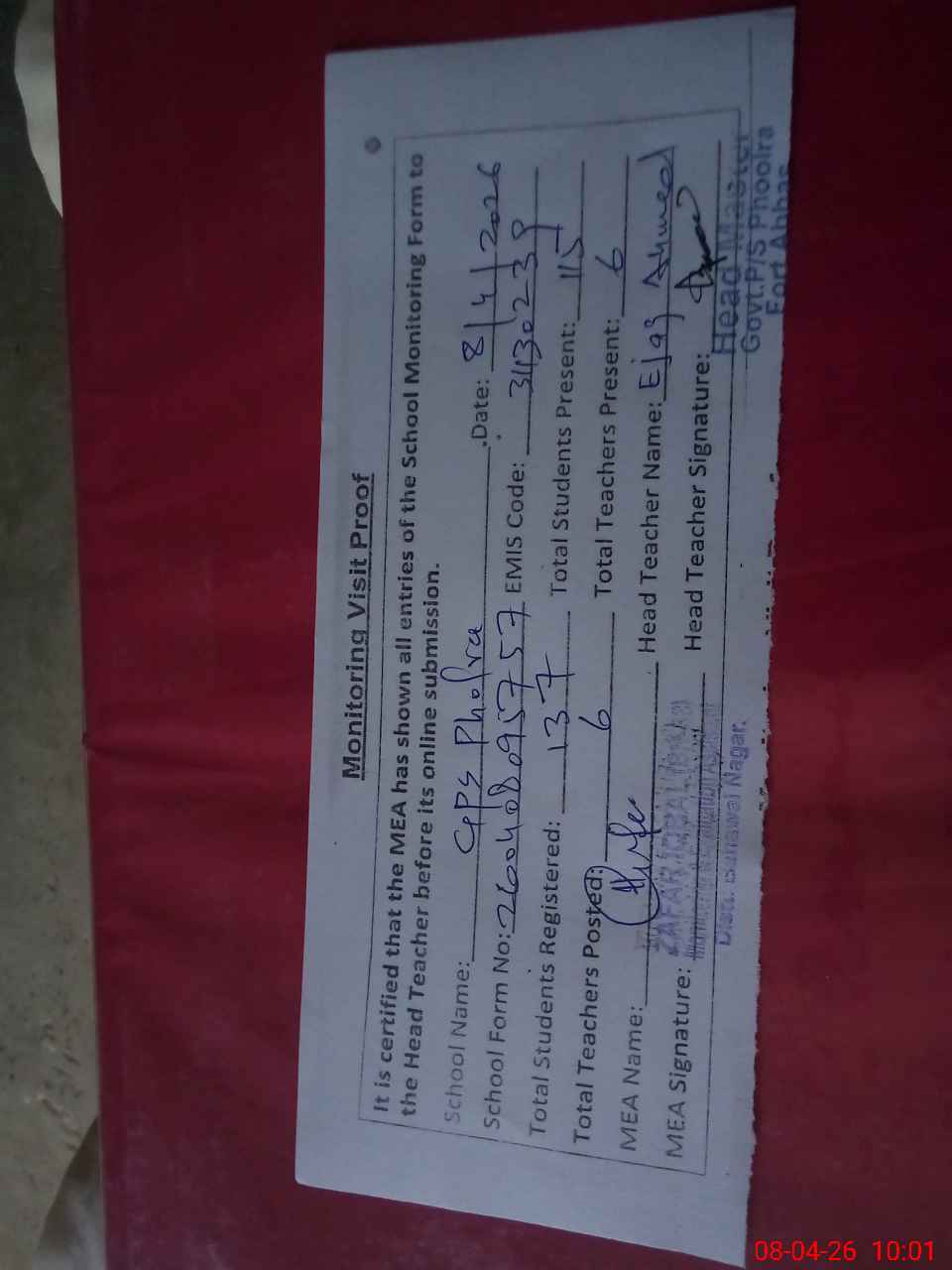| Attendance Register | Head Teacher | MEA with School | Visit Proof |