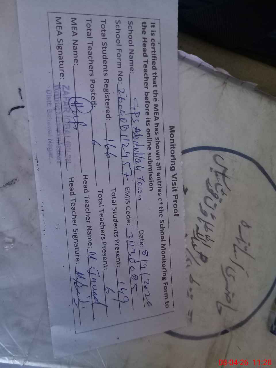 | Attendance Register | Head Teacher | MEA with School | Visit Proof |