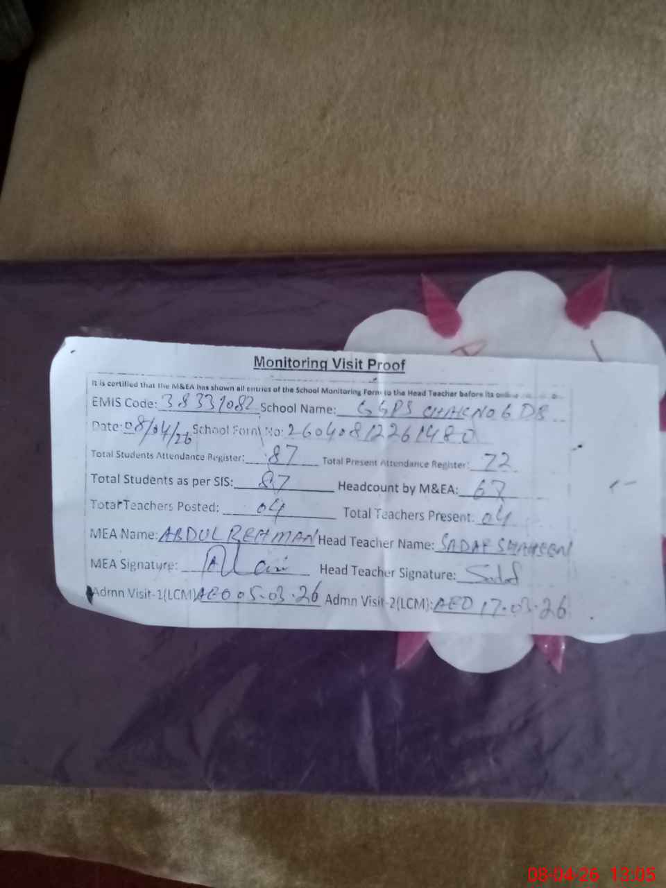 | Attendance Register | Head Teacher | MEA with School | Visit Proof |