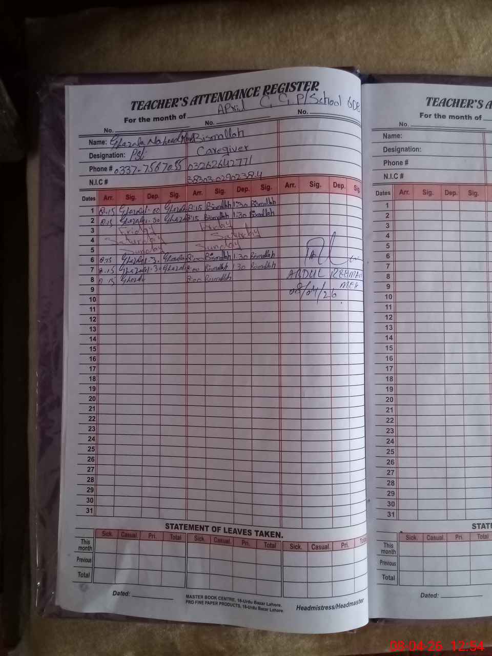 | Name: SA**** SH**** Designation: (School Headmaster's/Headmistress's) PST Phone/Cell Number: 03**** |