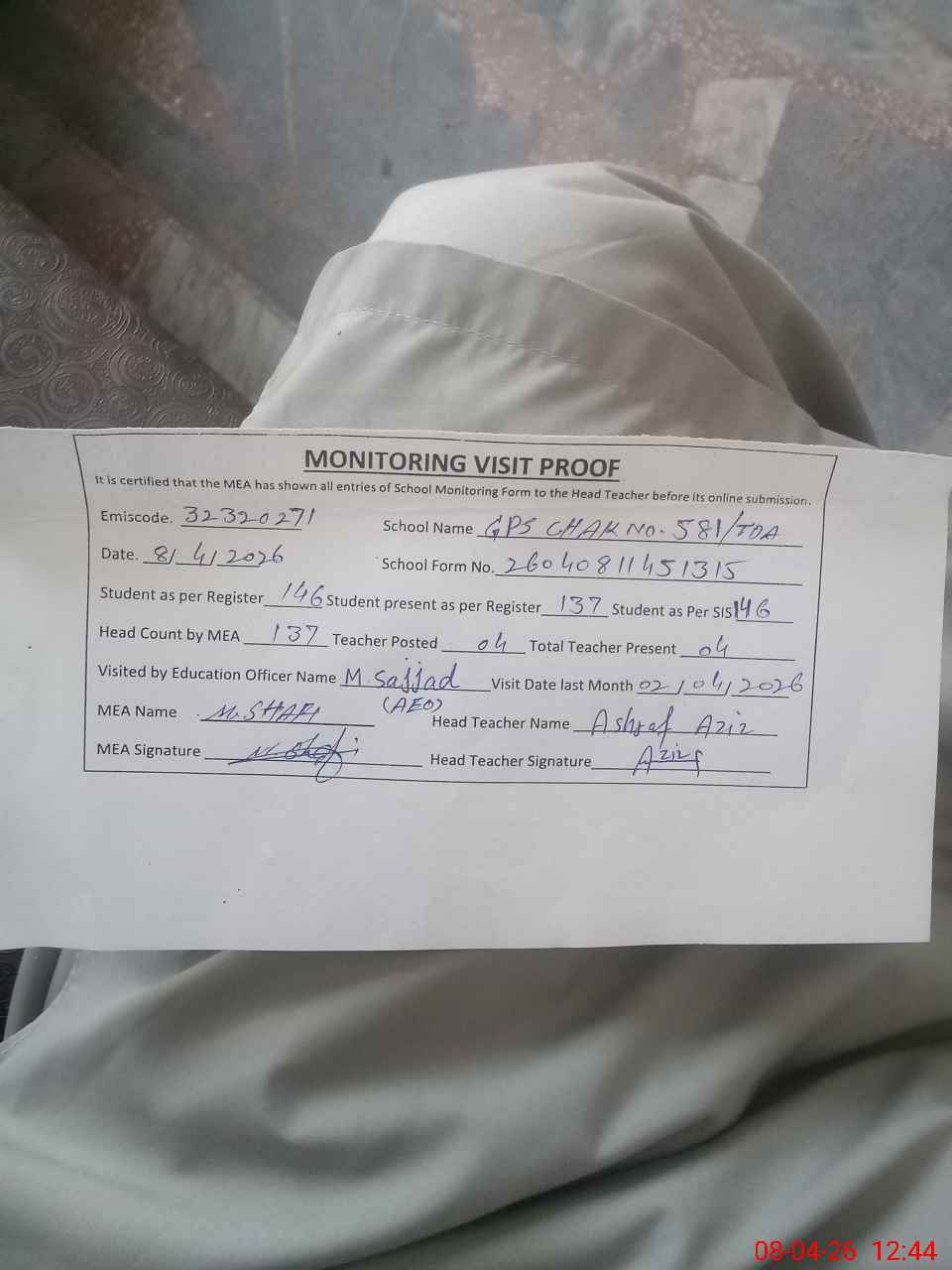 | EMIS Code: 32320271 | Name of School: GPS CHAK NO.581 TDA | |||