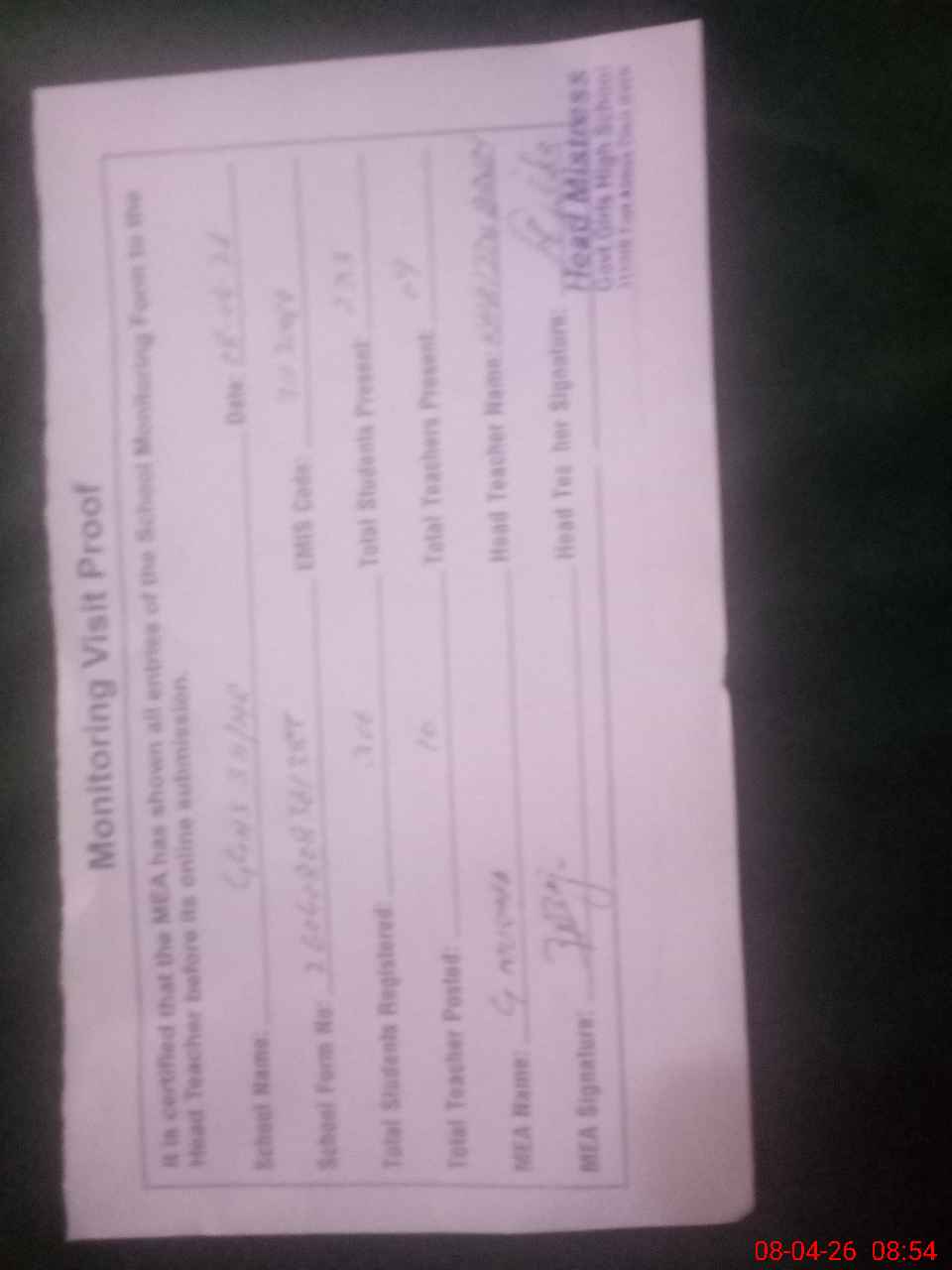| Attendance Register | Head Teacher | MEA with School | Visit Proof |