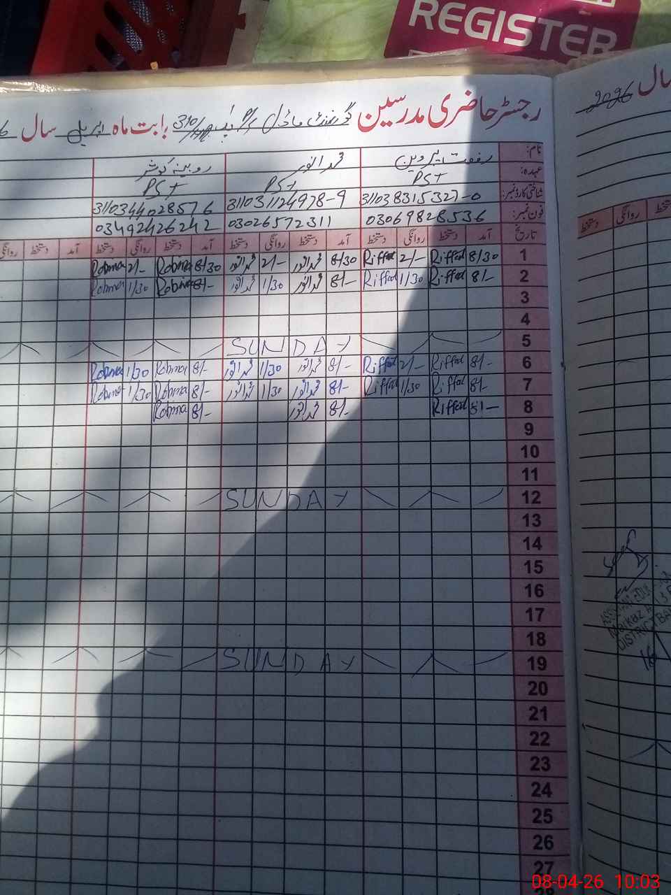 | CNIC | Full Name | Designation | R/C | Absence During Last Calender Month |