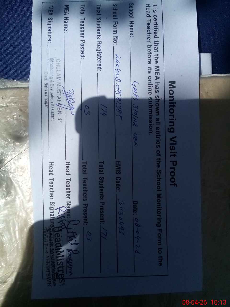 | Attendance Register | Head Teacher | MEA with School | Visit Proof |
