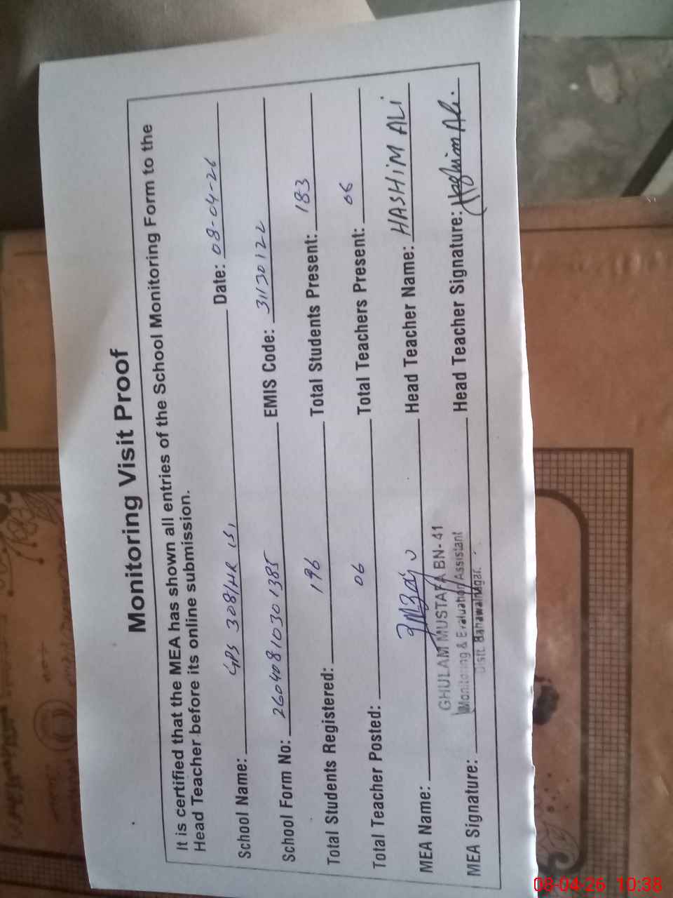 | Attendance Register | Head Teacher | MEA with School | Visit Proof |