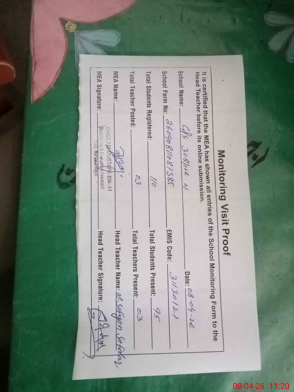| Attendance Register | Head Teacher | MEA with School | Visit Proof |