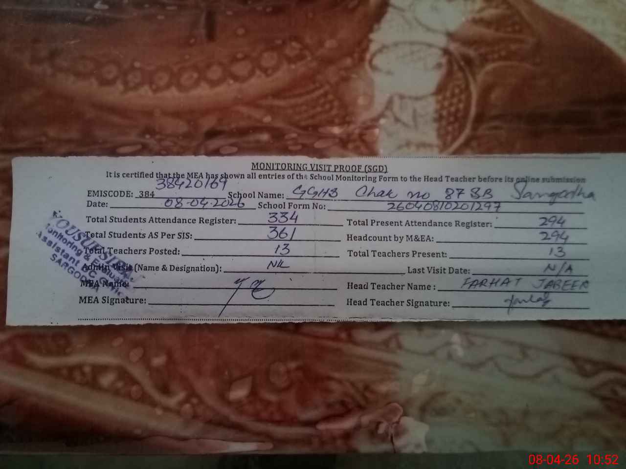 | EMIS Code: 38420169 | Name of School: GGHS CHAK NO.87 SB | |||