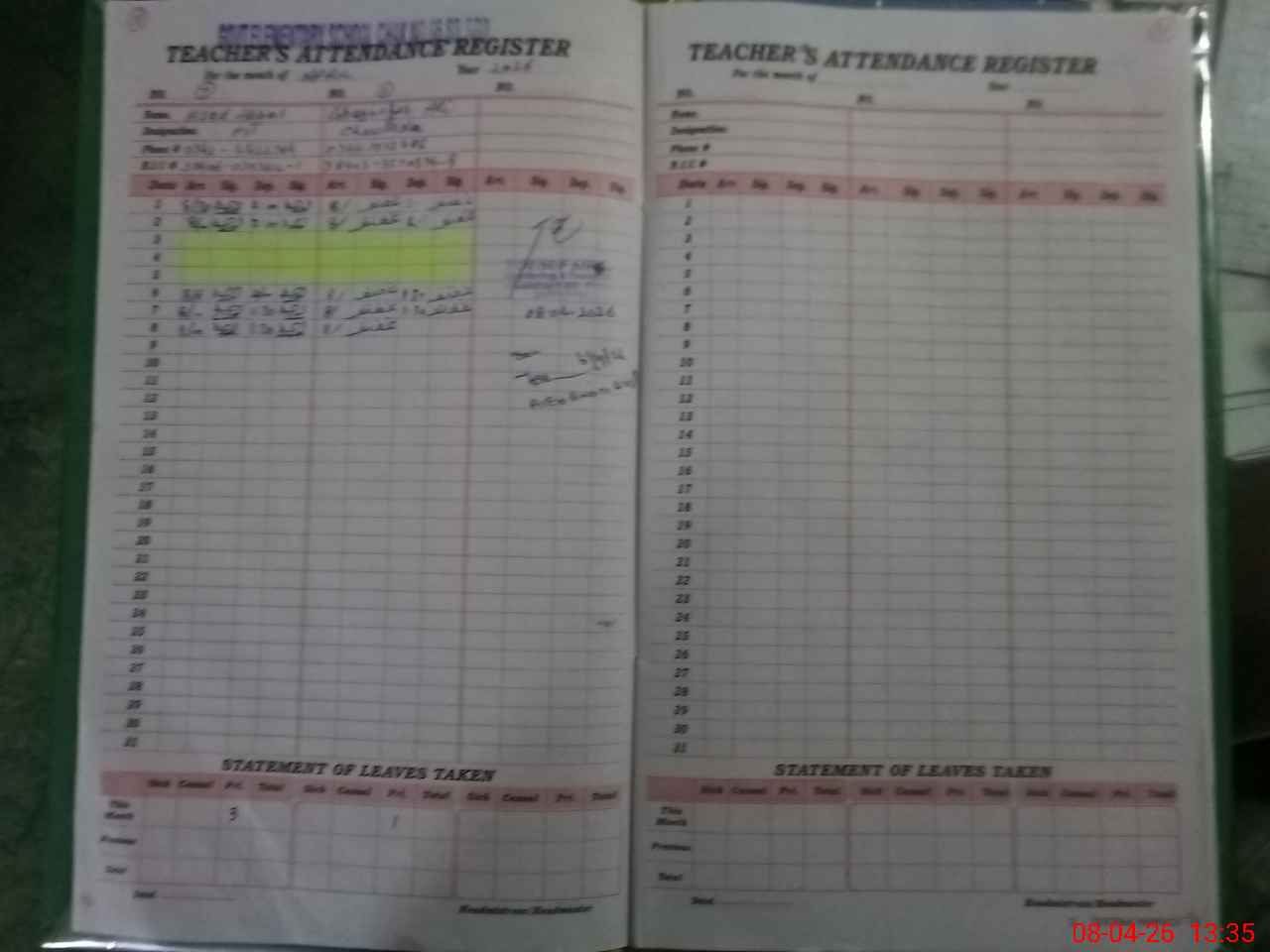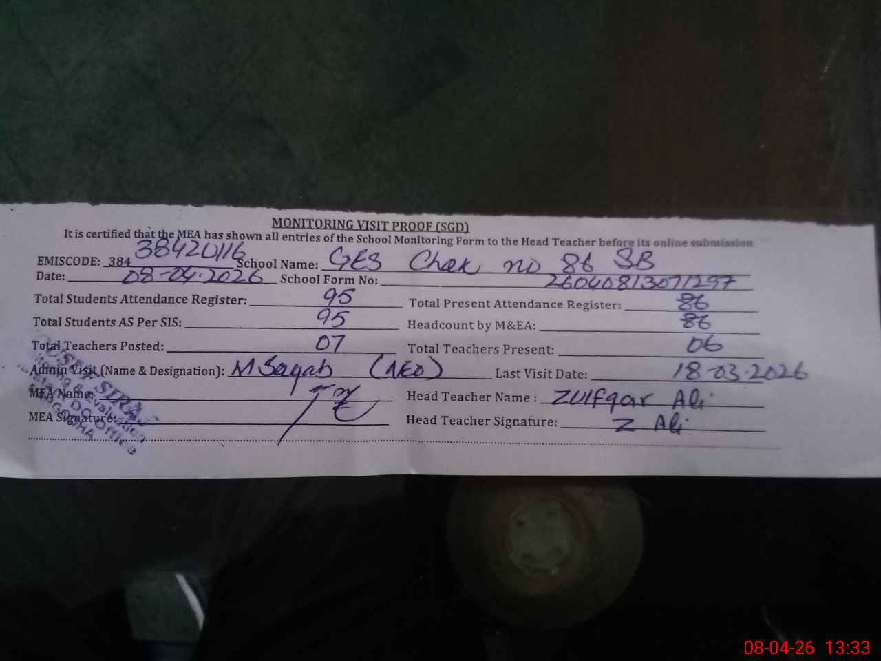 | Attendance Register | Head Teacher | MEA with School | Visit Proof |