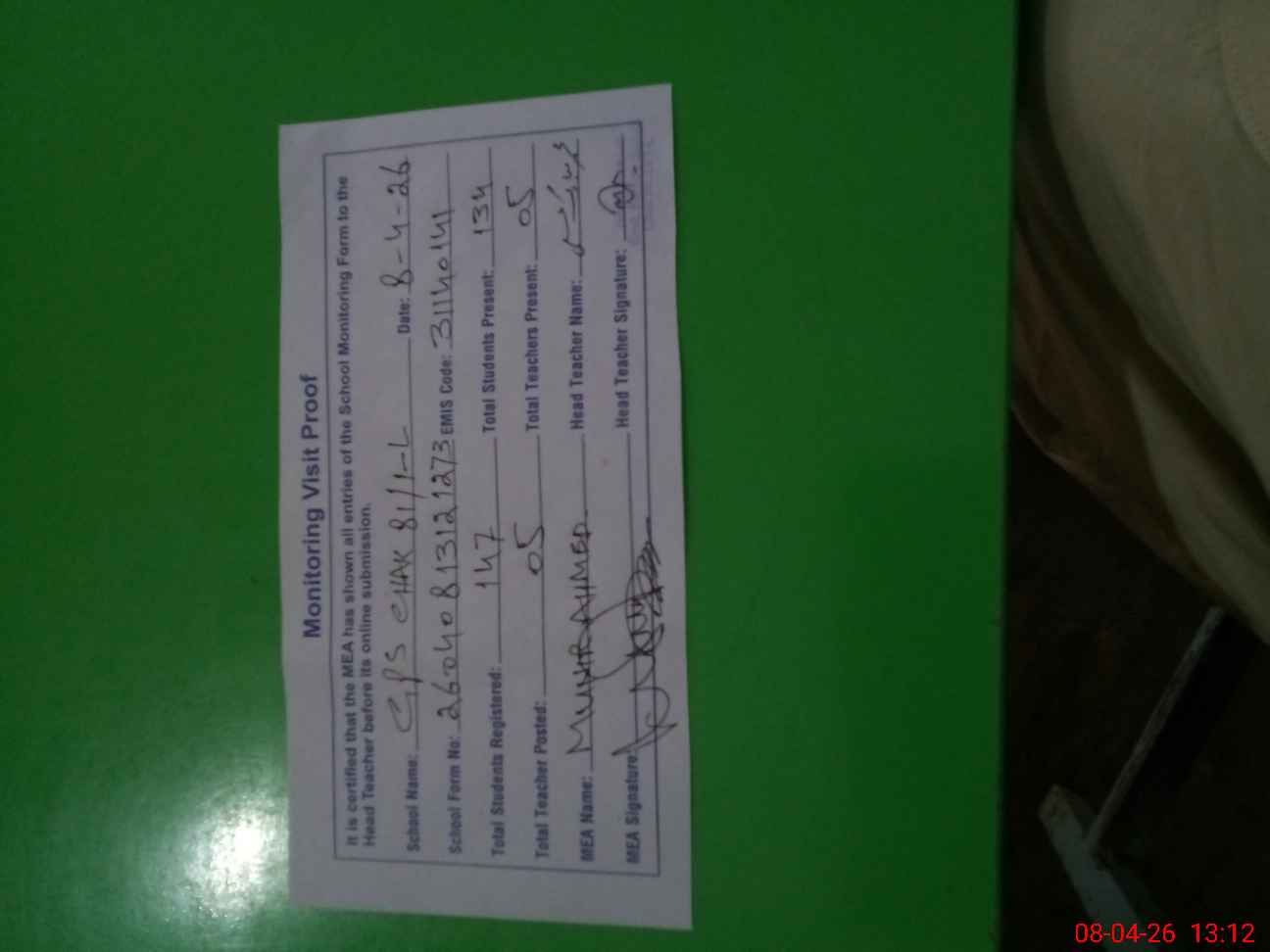 | Attendance Register | Head Teacher | MEA with School | Visit Proof |