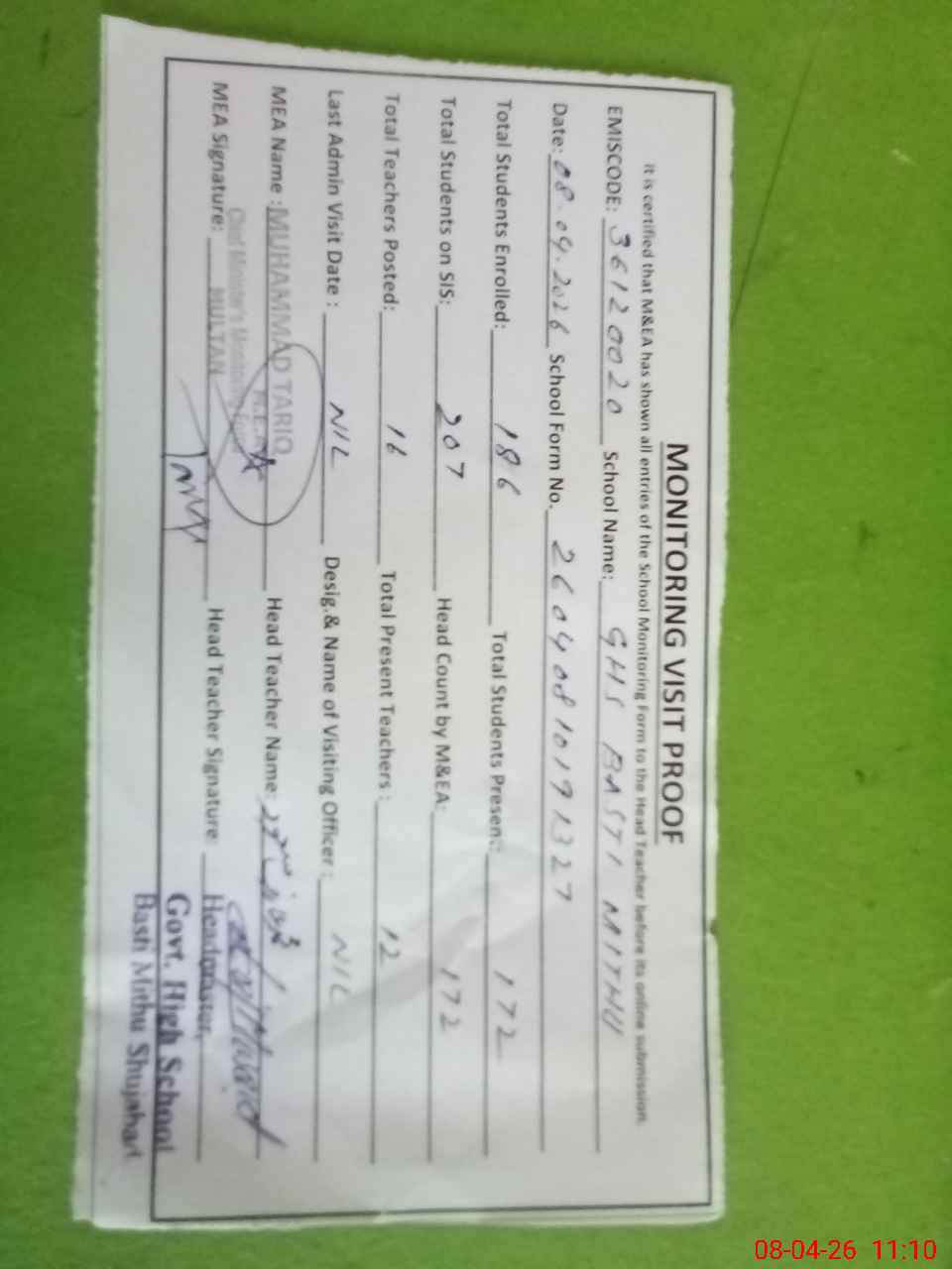 | Certified that this School was Inspected by the Undersigned MEA/DMO Today and the Information Stated Above is as Per Record. | |||||