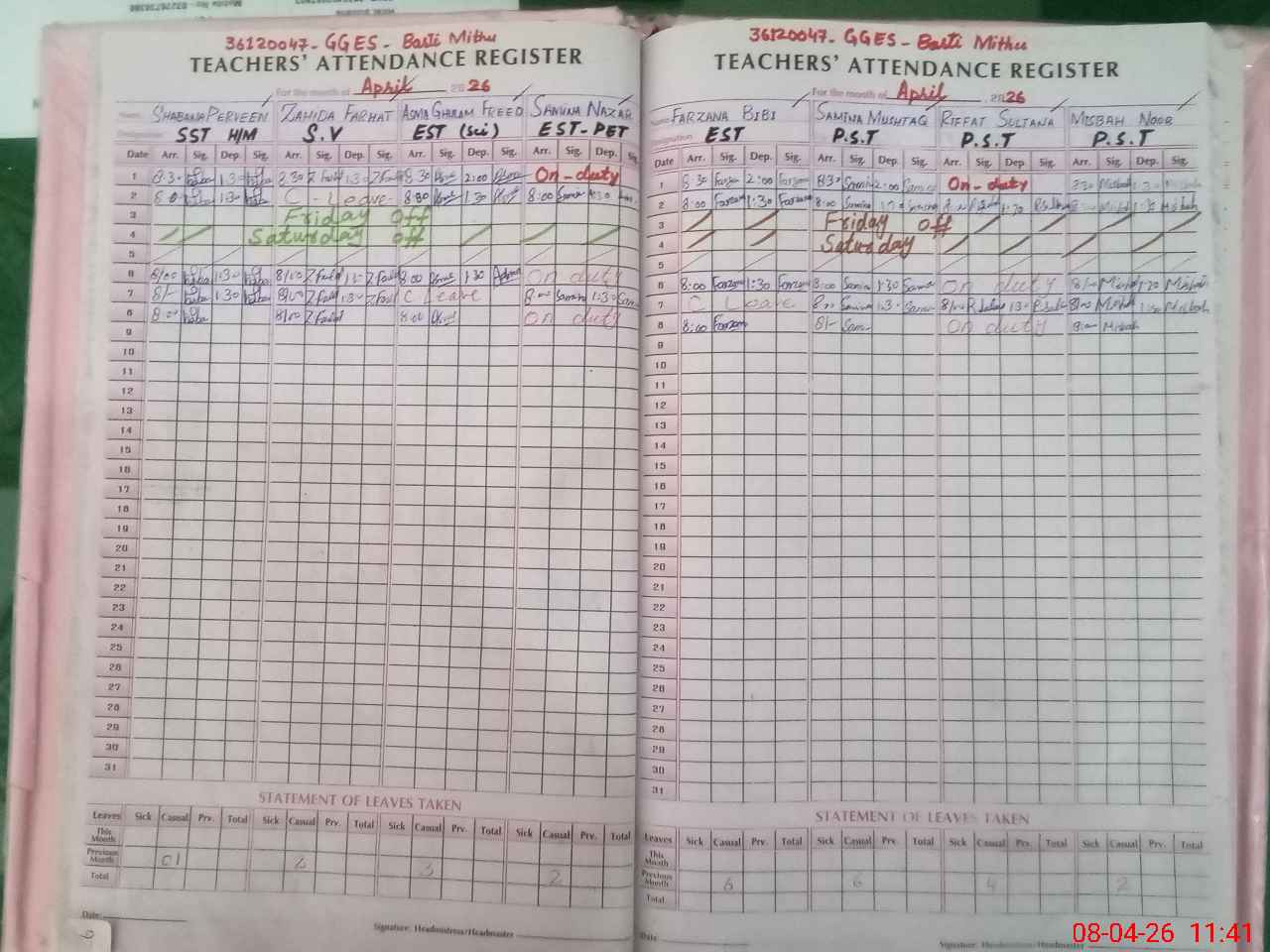 | 36**** | Ri**** Su**** | PST Arts | Regular | 0 | 0 | 0 | 0 | 0 | 0 | 0 | 0 | 0 | Exam Duty |