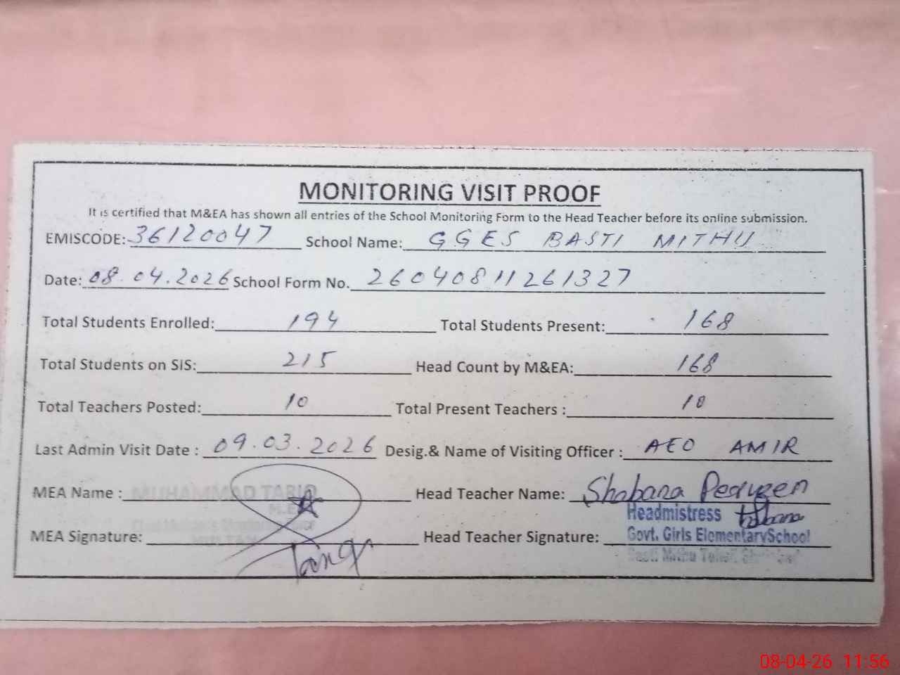 | Certified that this School was Inspected by the Undersigned MEA/DMO Today and the Information Stated Above is as Per Record. | |||||