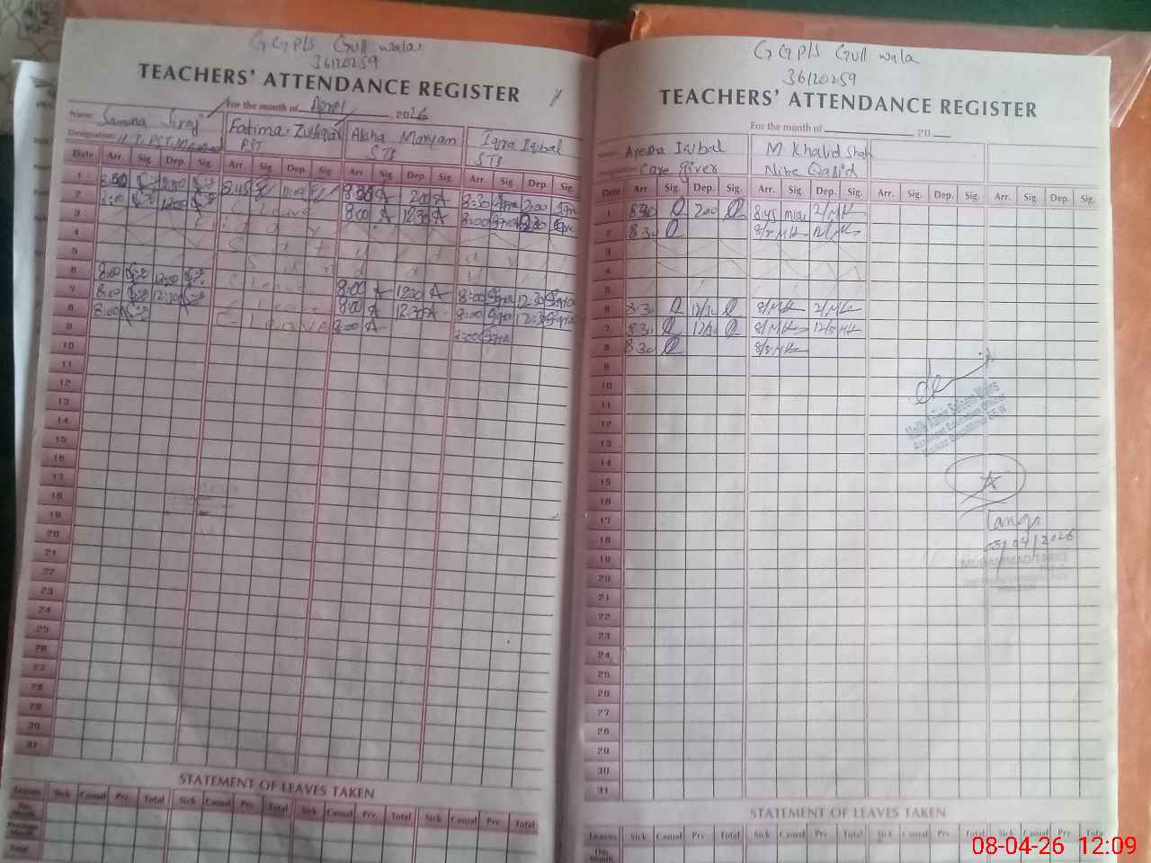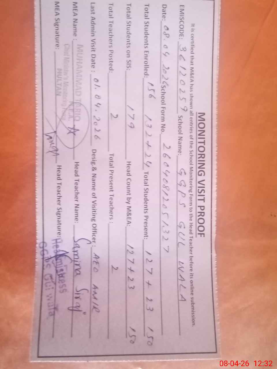 | Attendance Register | Head Teacher | MEA with School | Visit Proof |