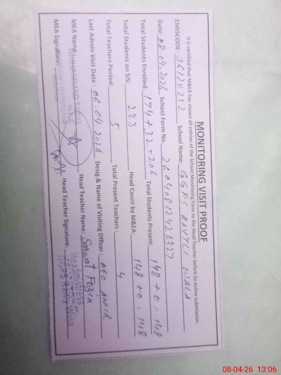 | EMIS Code: 36120252 | Name of School: GGPS RAYTLI WALA CHAH RATLI WALA SHUJABAD | |||