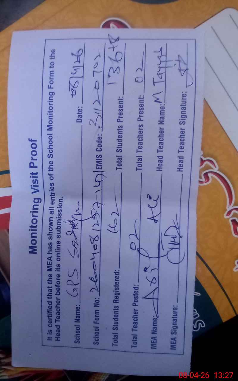 | Attendance Register | Head Teacher | MEA with School | Visit Proof |