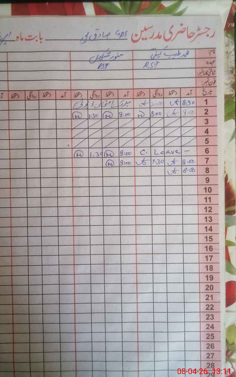 | CNIC | Full Name | Designation | R/C | Absence During Last Calender Month |