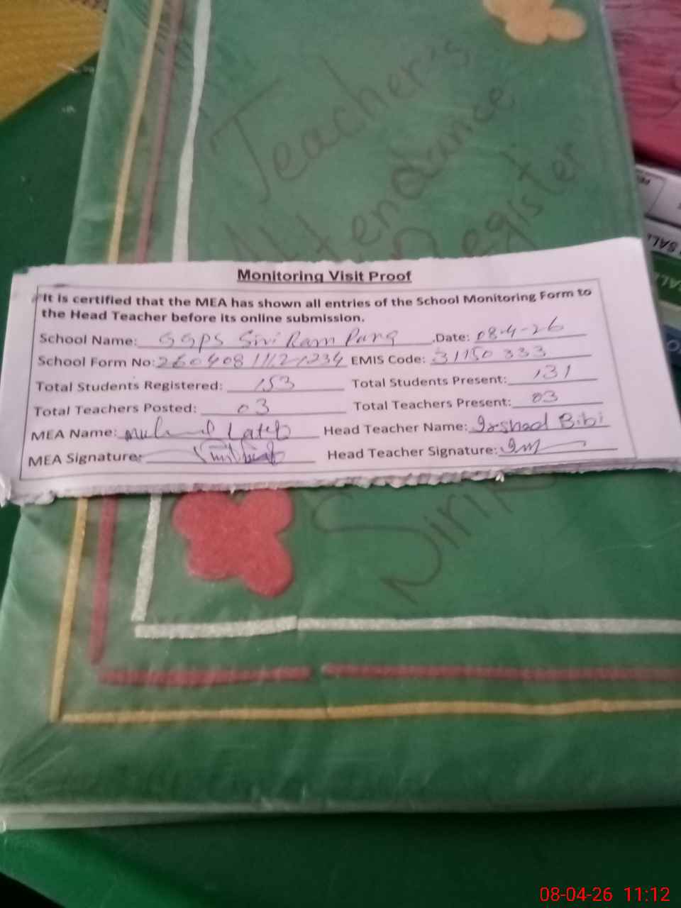 | Attendance Register | Head Teacher | MEA with School | Visit Proof |