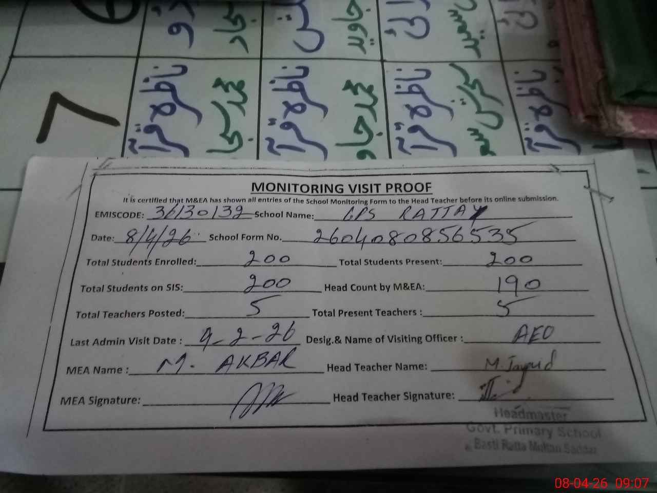 | Attendance Register | Head Teacher | MEA with School | Visit Proof |