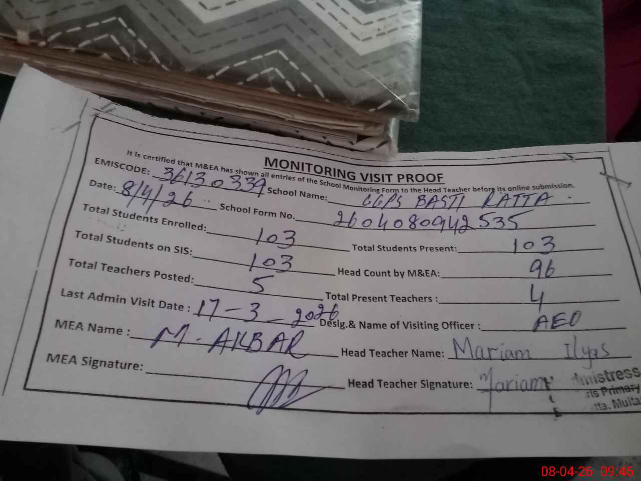 | Attendance Register | Head Teacher | MEA with School | Visit Proof |