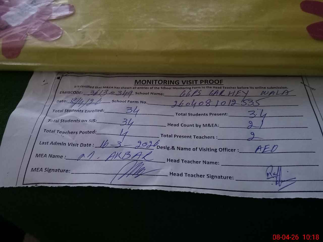 | Attendance Register | Head Teacher | MEA with School | Visit Proof |