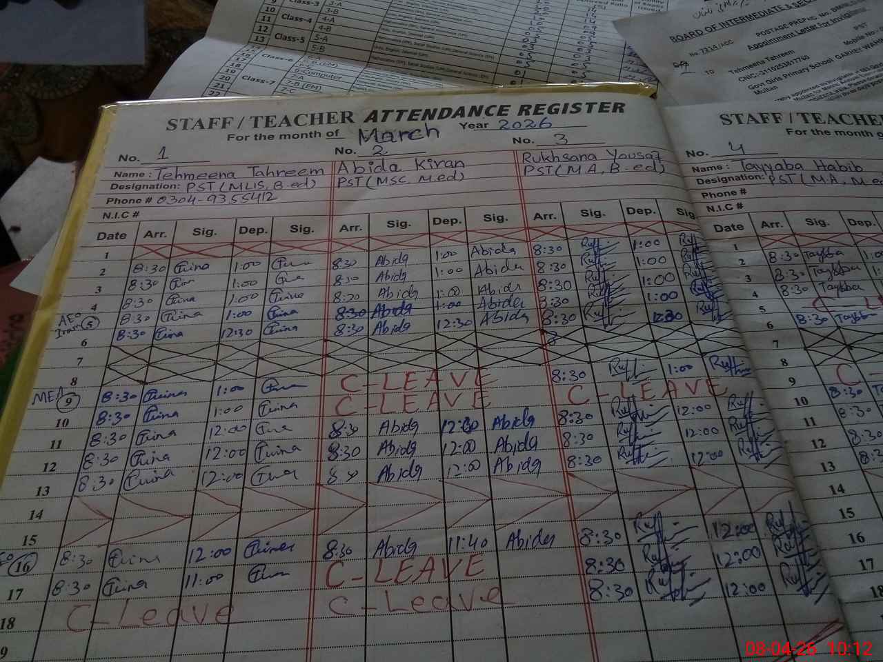 | CNIC | Full Name | Designation | R/C | Absence During Last Calender Month |