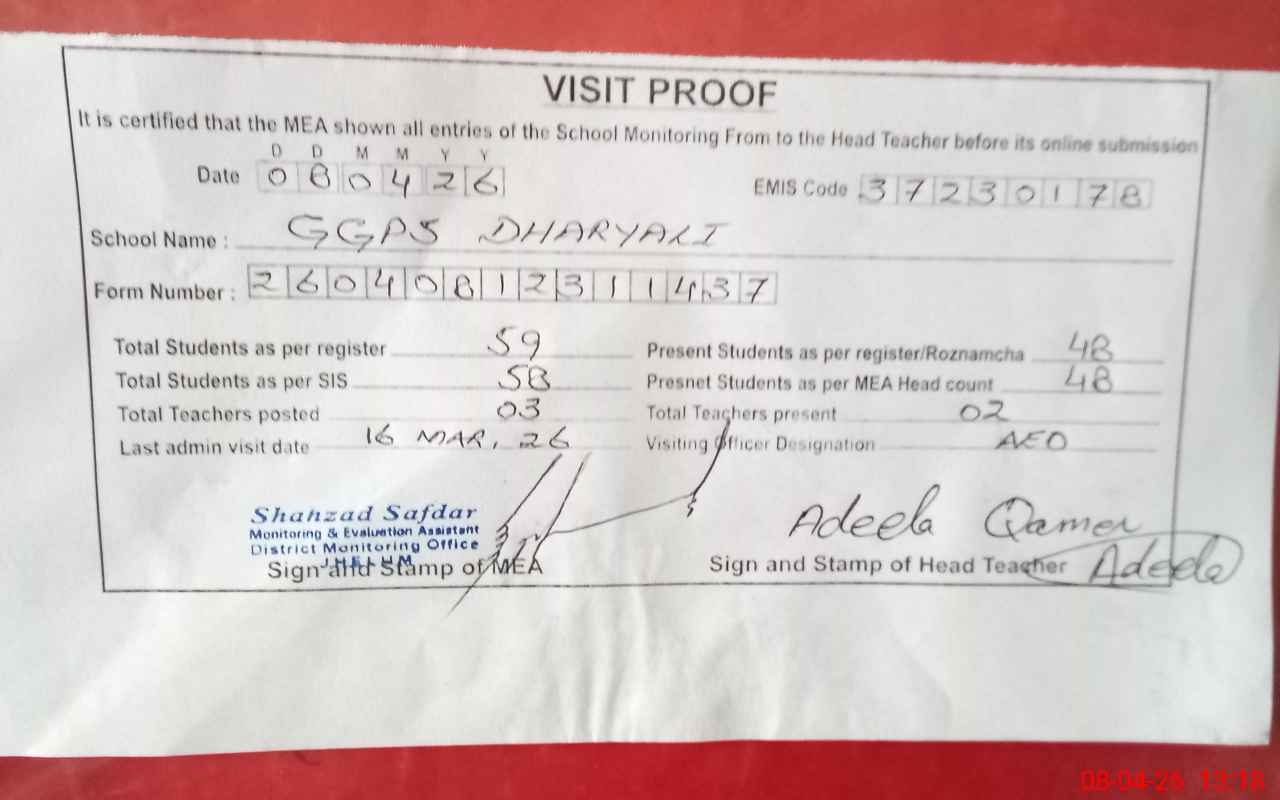 | EMIS Code: 37230178 | Name of School: GGPS DHARYALI | |||
