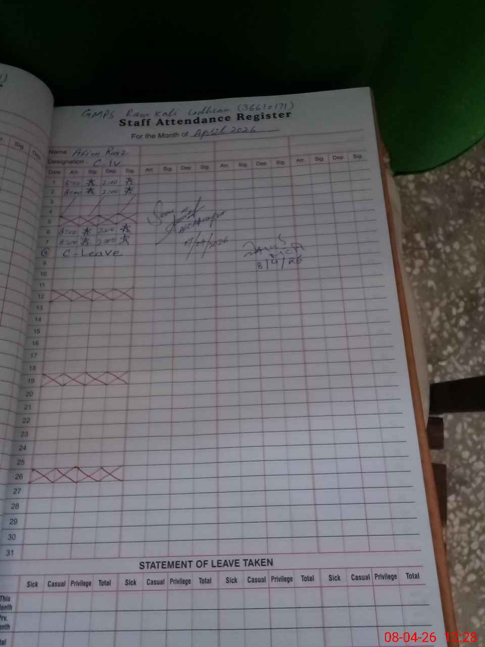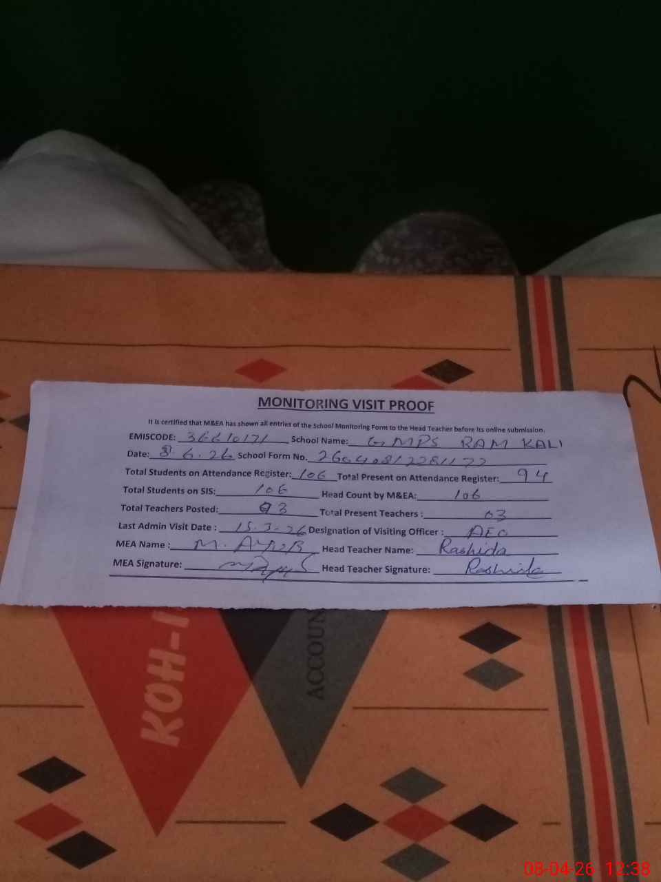 | Attendance Register | Head Teacher | MEA with School | Visit Proof |