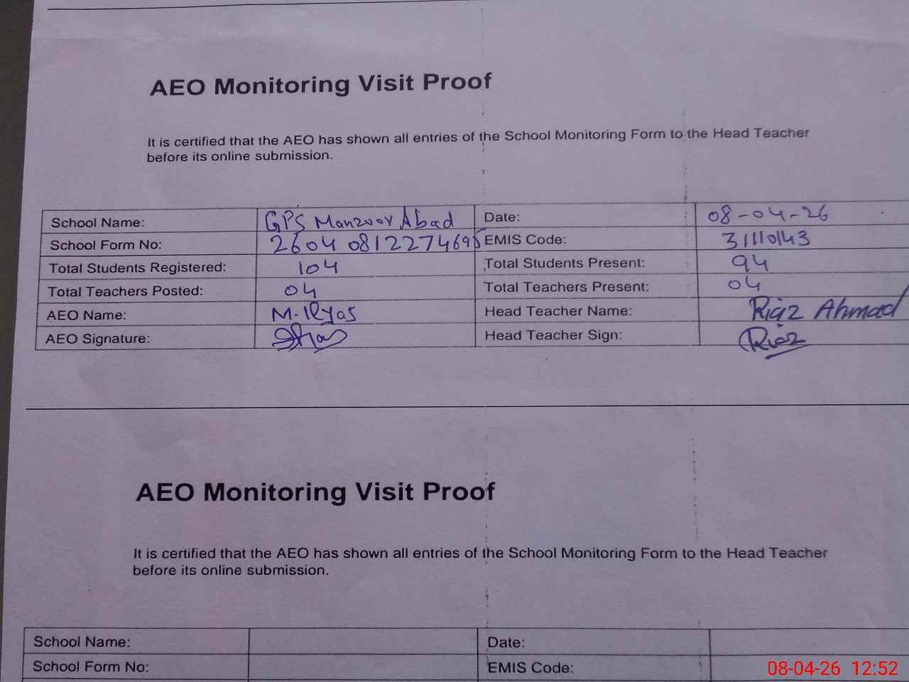 | Certified that this School was Inspected by the Undersigned MEA/DMO Today and the Information Stated Above is as Per Record. | |||||