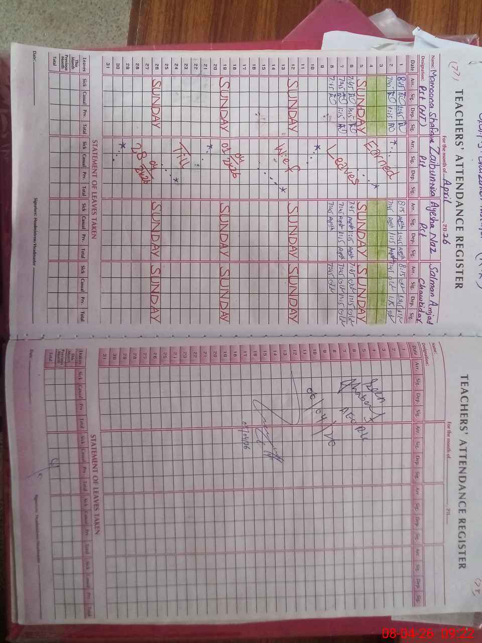 | Leave | Duty | Absent | Maternity | Medical | Ex- Pak |