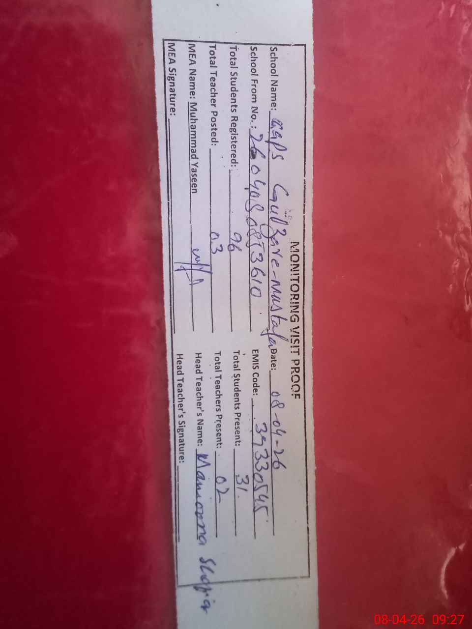 | Attendance Register | Head Teacher | MEA with School | Visit Proof |
