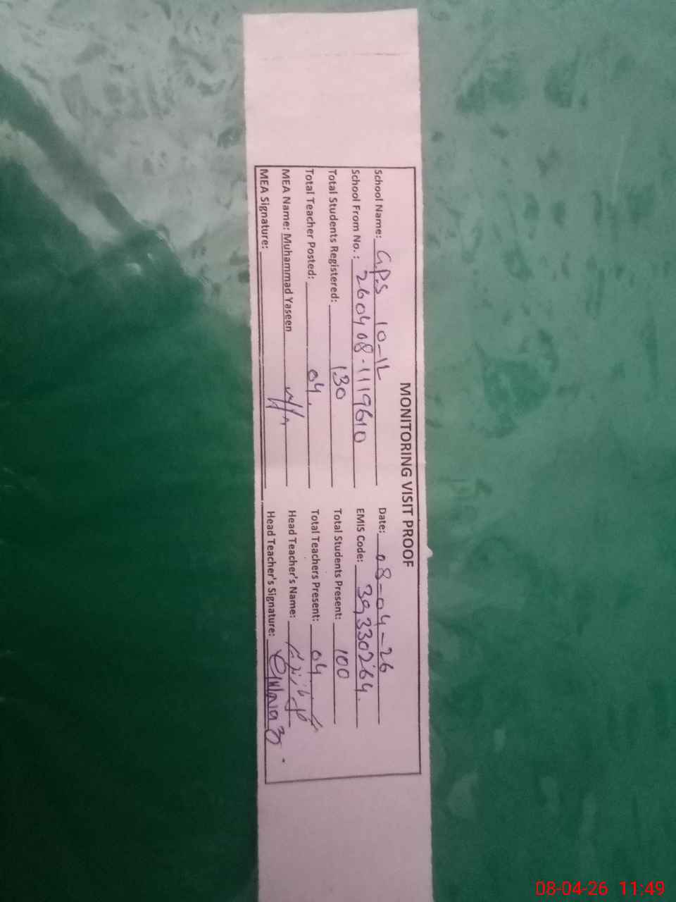 | Attendance Register | Head Teacher | MEA with School | Visit Proof |