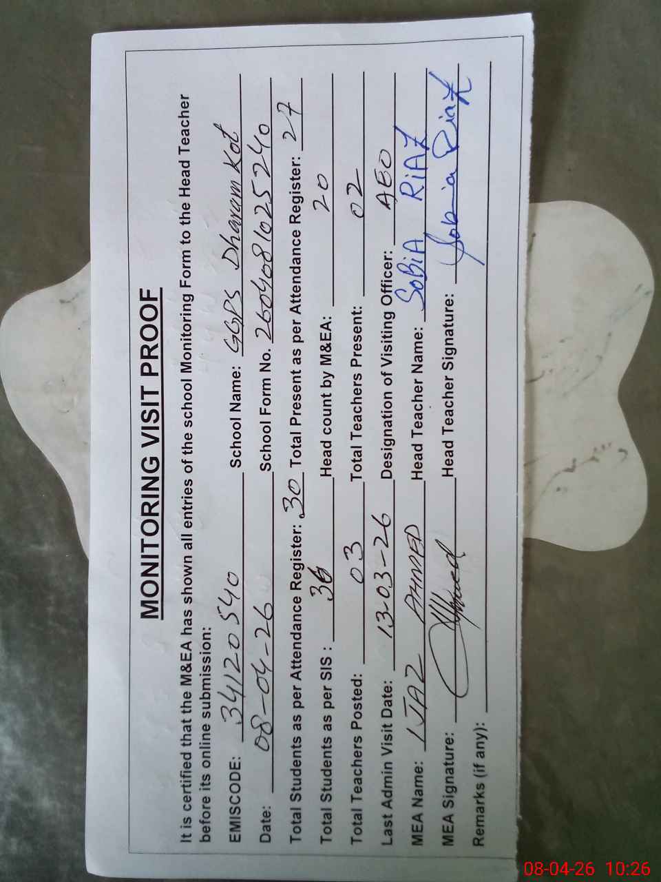 | Attendance Register | Head Teacher | MEA with School | Visit Proof |