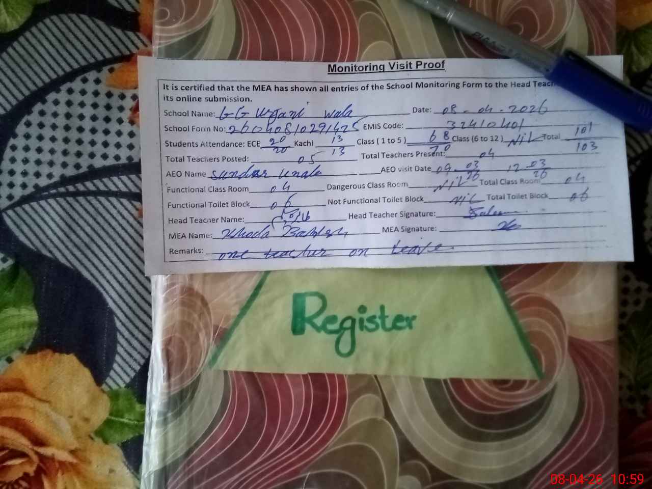 | Remarks (Use Separate Page if Required): one teacher on leave over all cleanliness good | |||||