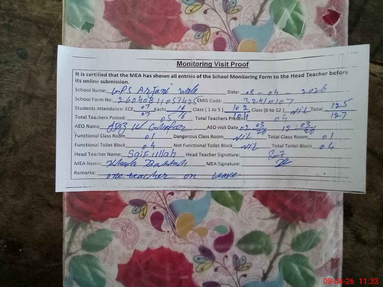 | EMIS Code: 32410107 | Name of School: GPS ARJANI WALA | |||