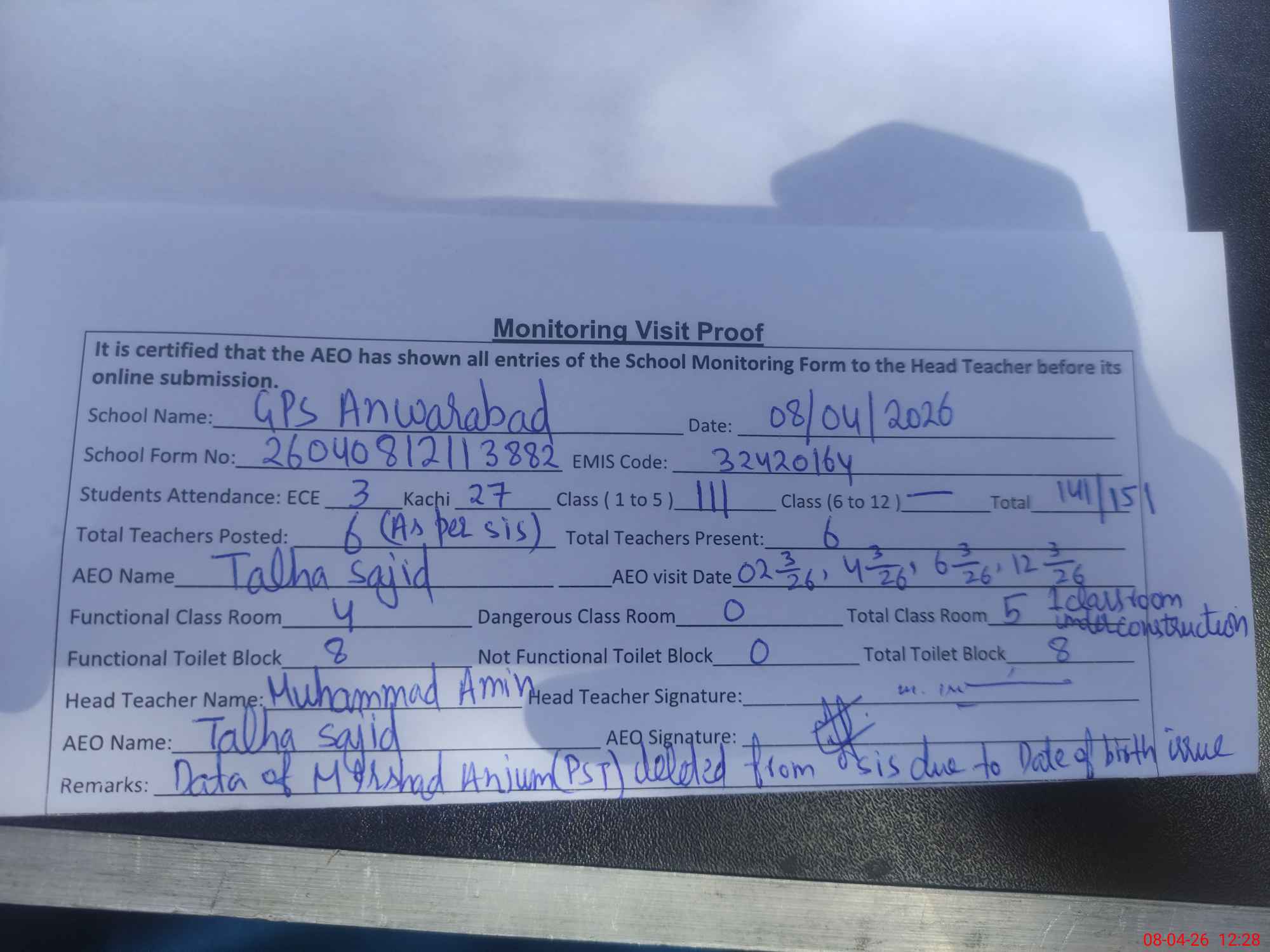 | EMIS Code: 32420164 | Name of School: GPS ANWAR ABAD | |||