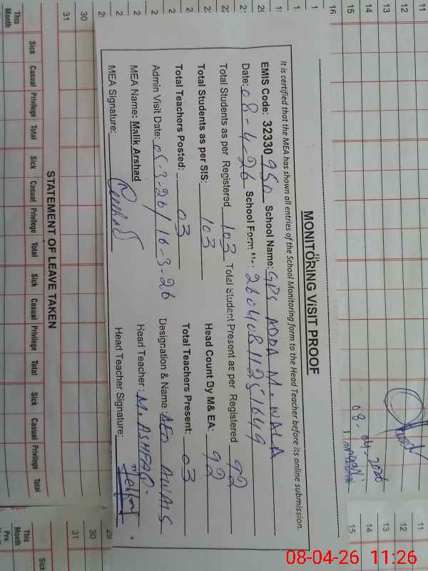 | EMIS Code: 32330950 | Name of School: GPS ADDA MUHAMMAD WALA | |||