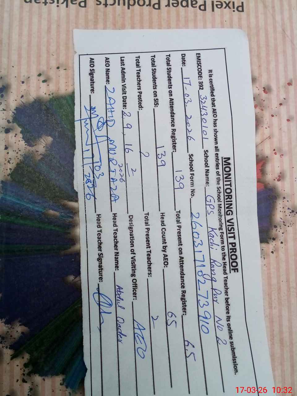 | EMIS Code: 32430101 | Name of School: GPS KACHI RANG PUR NO. 2 | |||