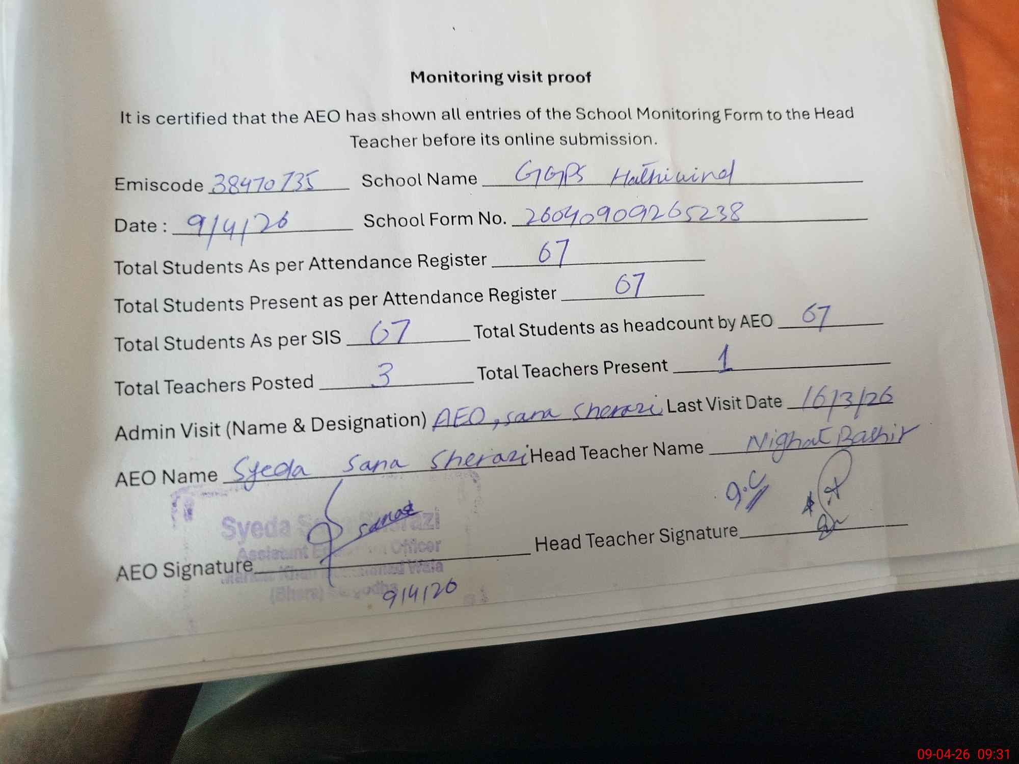 | Attendance Register | Head Teacher | MEA with School | Visit Proof |