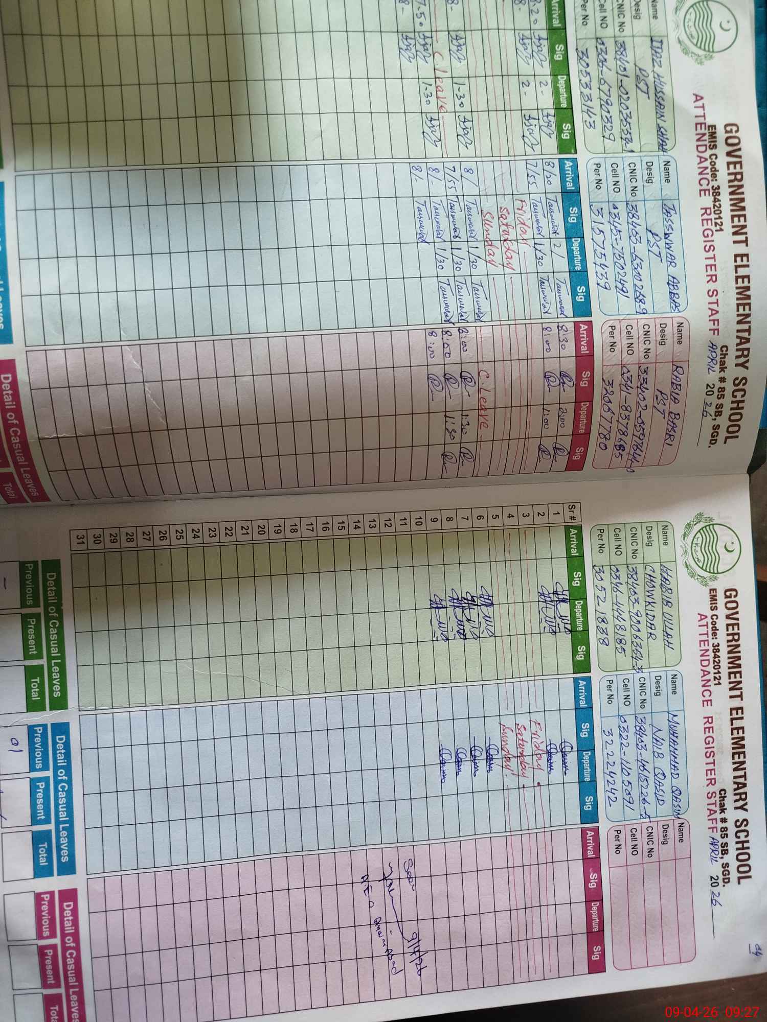 | CNIC | Full Name | Designation | R/C | Absence During Last Calender Month |