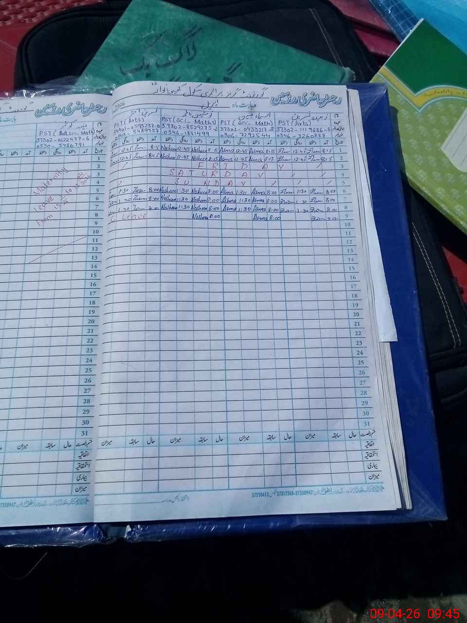 | Total no. of Classrooms: 4 No. of Classrooms Used for Teaching: 4 No. of Classrooms Storing Old Furniture, FTBs, etc: 0Comments if Any: Sir. PST Teacher Nasreen Absent from school in front of me PST Teacher Zubaida sign the teacher attendance register In front of Teacher Nasreen no mention leave or present . In front of me written leave in red pencil and apply in front of me. Divisional |