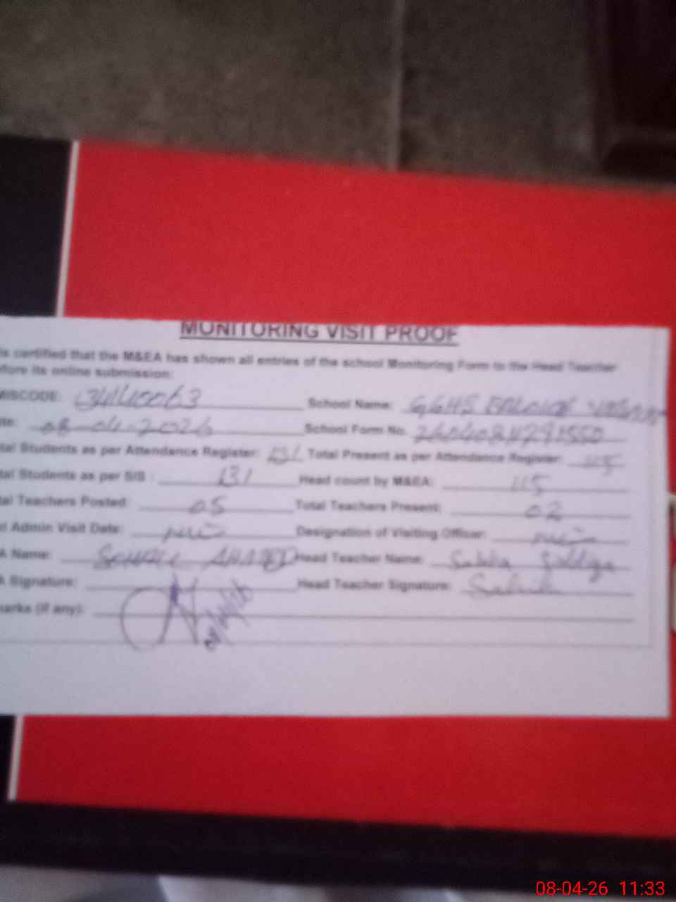 | Attendance Register | Head Teacher | MEA with School | Visit Proof |