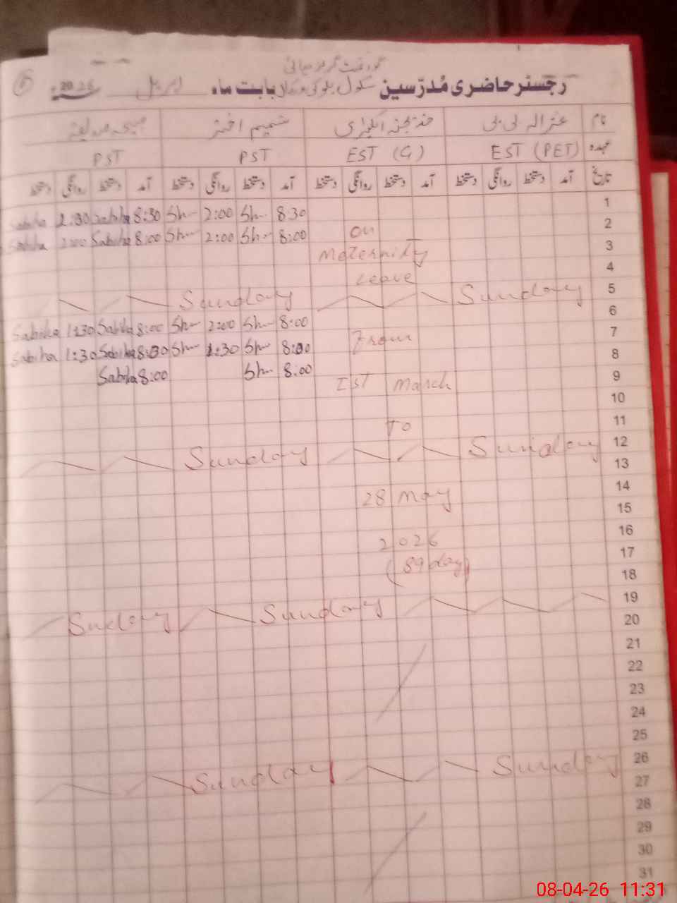 | 35**** | Fa**** Na**** Vi**** | PST Science/Maths | Regular | 0 | 0 | 0 | 0 | 0 | 0 | 0 | 0 | 0 | Absent (Un-Authorized) |