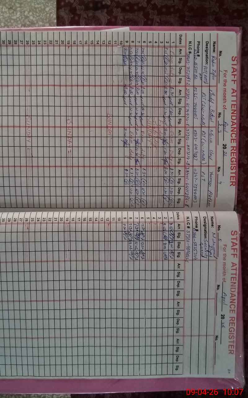 | CNIC | Full Name | Designation | R/C | Absence During Last Calender Month |