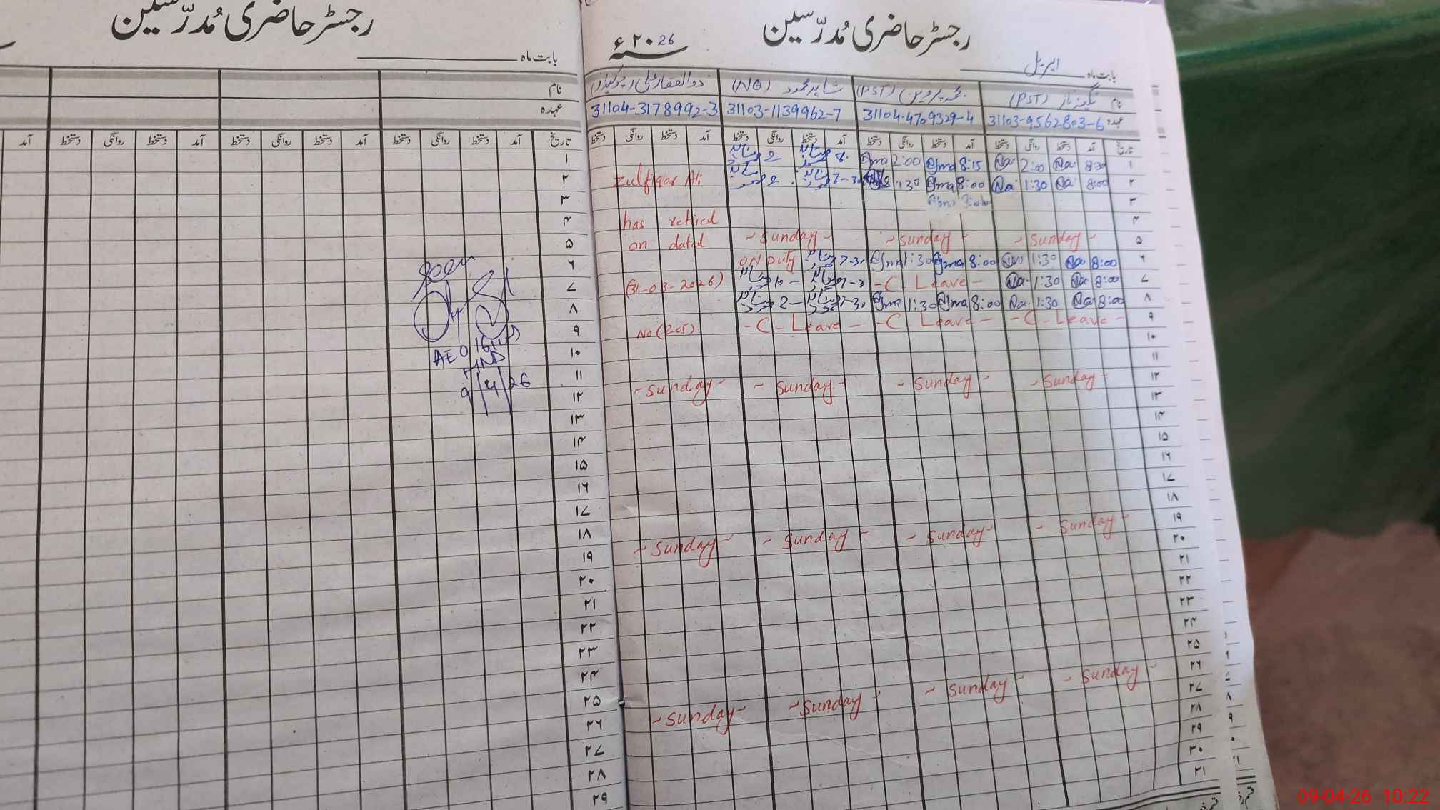 | CNIC | Full Name | Designation | R/C | Absence During Last Calender Month |